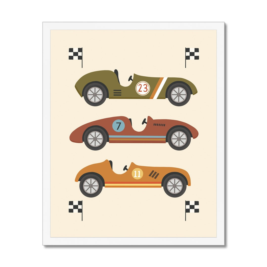 Race Cars in green, brown and orange / Framed Print